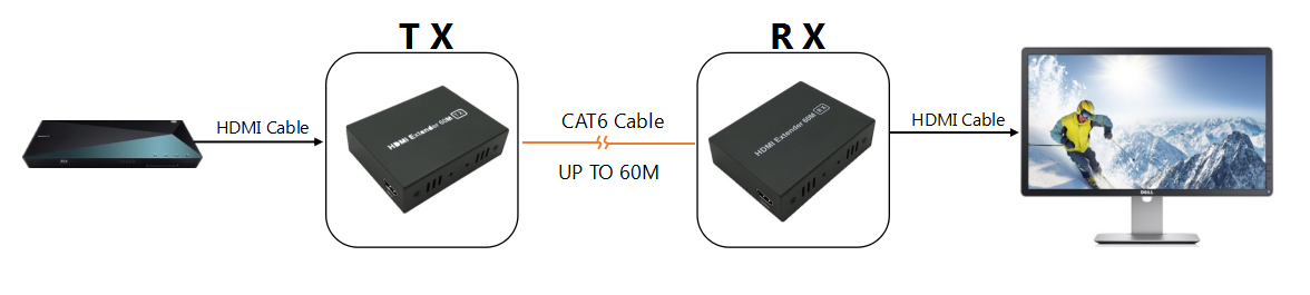 1.Transmits HDMI video and audio signals up to 60M over a single CAT6 cable;
