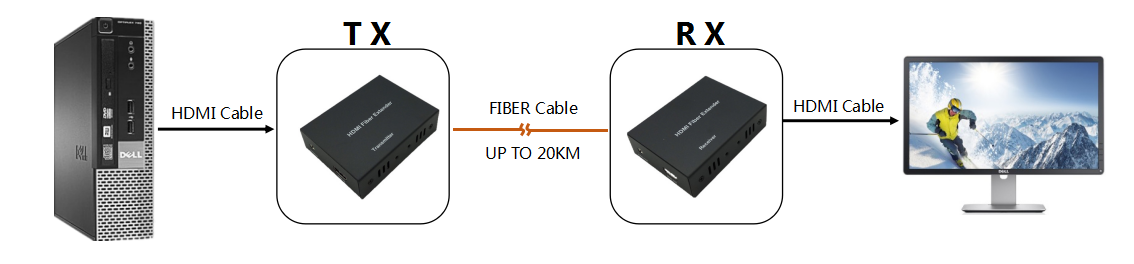 Transmits HDMI video and audio signals up to 20km over one fiber optic cable;
