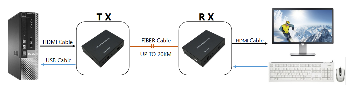 HDMI USB KVM Extender Via Fiber 1 single-mode single-core can be transmitted 20 km 2 the highest resolution up to 1920 * 1080P @ 60Hz 3 FC optical interface