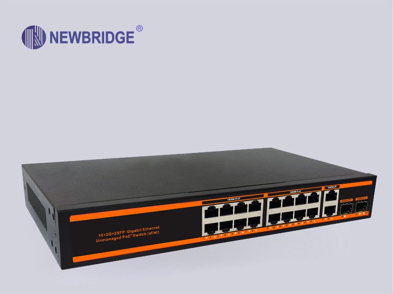 Newbridge®ND-HP1622G series PoE switch is designed by NEWBRIDGE for meeting the demand of PoE power supply. It adopts the latest high-speed Ethernet switching chip and ultra-high backplane bandwidth design, with extremely fast data processing capability to improve smooth data transmission performance. It has 16 PoE-powered RJ45 ports, 2 RJ45 uplink ports and two independent SFP expansion slots . All of sixteen RJ45 ports support IEEE 802.3af/at standard , with a maximum power supply of 30W for a single port and 300W for the whole machine, which can automatically detect and identify the powered devices that comply with IEEE 802.3af/at standard and supply power for the priority mechanism through the network cable.
