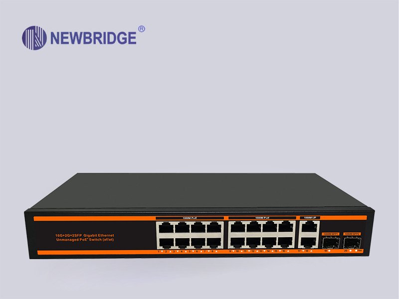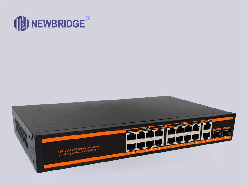 Newbridge®ND-HPG1622 series PoE switch is designed by NEWBRIDGE for meeting the demand of PoE power supply. It adopts the latest high-speed Ethernet switching chip and ultra-high backplane bandwidth design, with extremely fast data processing capability to improve smooth data transmission performance. It has 16 PoE-powered RJ45 ports, 2 RJ45 uplink ports and two independent SFP expansion slots . All of sixteen RJ45 ports support IEEE 802.3af/at standard , with a maximum power supply of 30W for a single port and 300W for the whole machine, which can automatically detect and identify the powered devices that comply with IEEE 802.3af/at standard and supply power for the priority mechanism through the network cable.