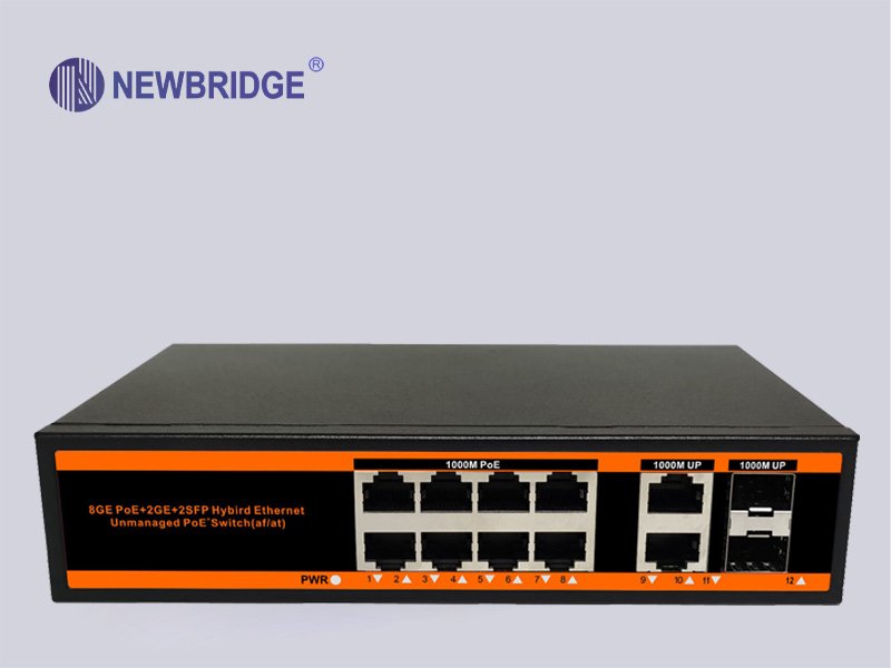 12 ports switch with 8*10/100/1000M bit PoE ports,2*10/100/1000M Uplink Port and 2*1000Mbps SFP Slot ,PoE Standard: IEEE 802.3af/at,PoE data & power transmission distance 100meters(100Mbps), 150W power supply