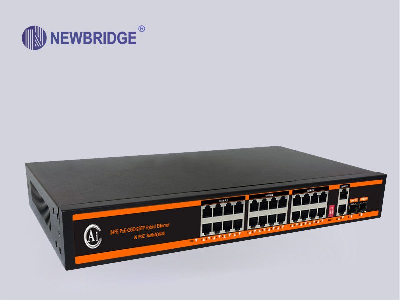 Newbridge®The 24-port 10/100Mbps AI PoE switch provides seamless data connectivity for 10/100Mbps Ethernet and PoE power for powered devices such as network surveillance cameras and wireless (AP).