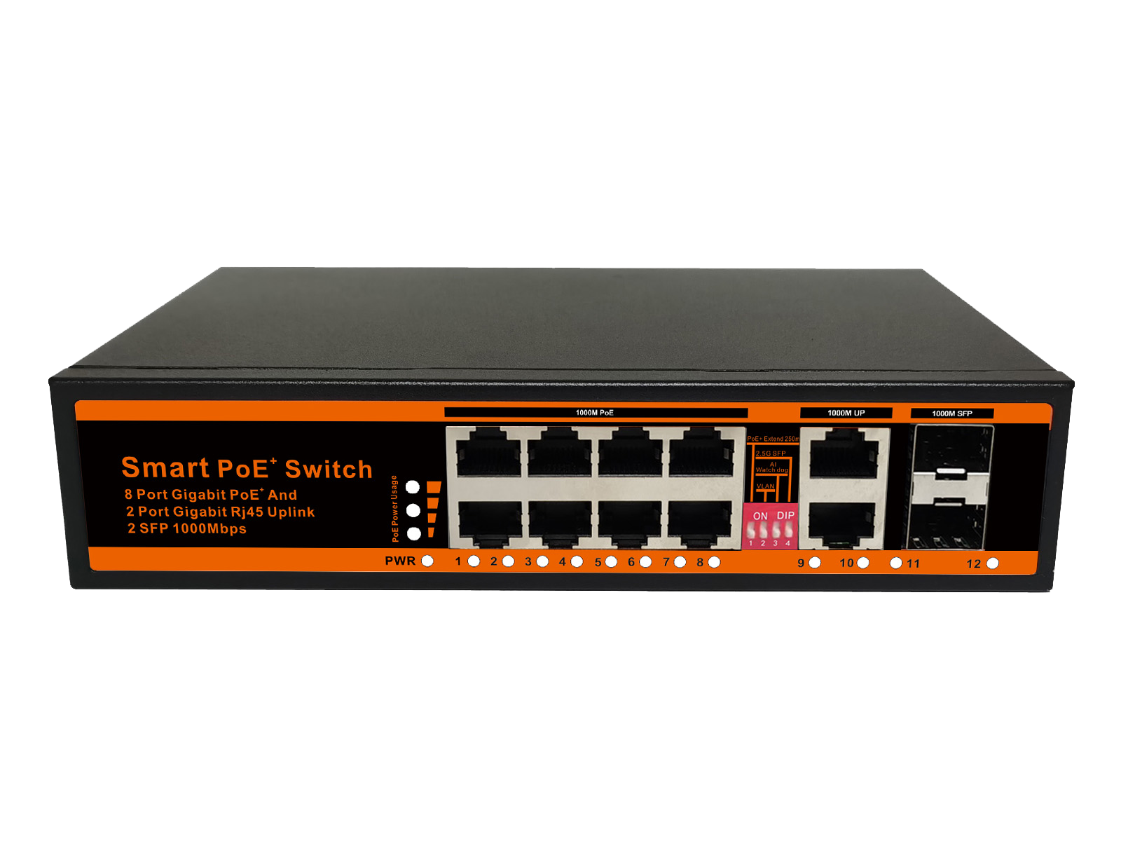 8*10/100/1000Mbps PoE ports, 2*10/100/1000Mbps uplink port,2*1000Mbps SFP Slot